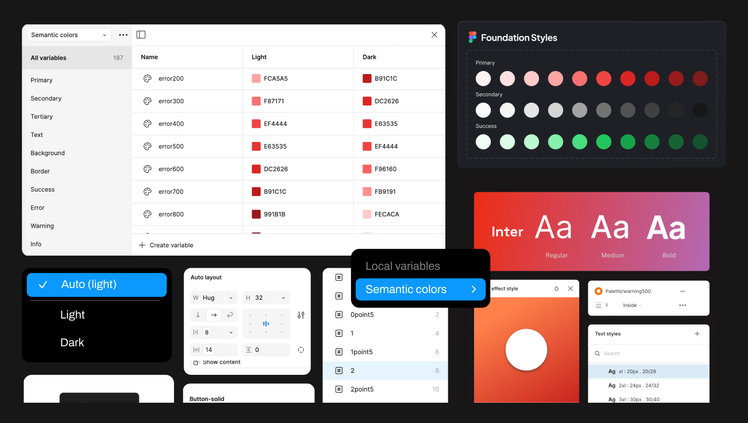 • Shadow Tokens: Shadow tokens, also known as effect styles, allow you to define and manage effects such as drop shadows, strokes, blurs, and images. Our kit includes two primary shadows, Hard and Soft, covering different light source directions and intensities.